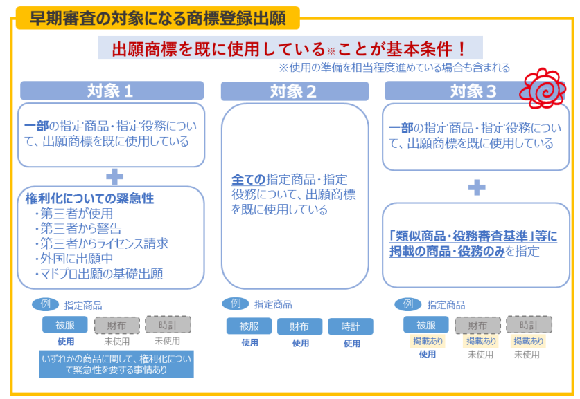 - 権利化について緊急性を要する事情があることが必要です。たとえば、第三者による商標の無断使用が確認されている、もしくは使用の可能性が高い状況(対象1)。